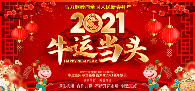 金鼠辭舊歲,金牛報(bào)春時。值此新春之際,馬力鋼砂向所有新老客戶獻(xiàn)上新春祝福,恭祝大家在牛年里身體健康、事業(yè)有成、萬事如意!...